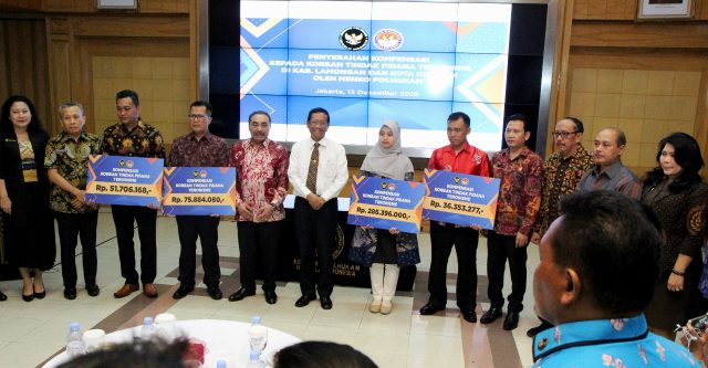 Kompensasi diberikan langsung oleh Menteri Koordinator Politik Hukum dan Keamanan Mahfud MD di Kantor Kementerian Koordinator Politik Hukum dan Keamanan, Jalan Medan Merdeka Barat, Jakarta, Jum’at (13/12). Penyerahan kompensasi kepada korban disaksikan oleh Ketua LPSK Hasto Atmojo Suroyo serta beberapa tamu undangan lainnya.
