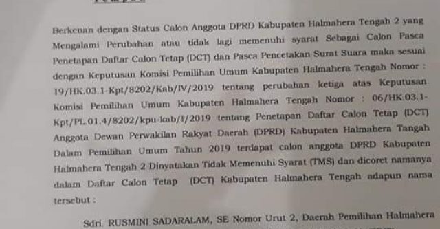 KPU kata Abubakar, telah mengeluarkan edaran tentang status Rusmini yang telah dicoret dari DCT, sehingga dapat disampaikan kepada masyarakat, karena status Caleg DPRD Halteng 2 mengalami perubahan atau tidak lagi memenuhi syarat sebagai calon pasca penetapan DCT dan pasca pencetakan surat suara maka sesuai dengan keputusan  KPU Halteng Nomor :19/HK.03.1-kpt/8202/kab/IV/2019 tentang perubahan ketiga atas keputusan KPU Halteng nomor:06/HK.03.1- kpt/PI.01.4/8202/KPU – Kab/1/2019.tentang penetapan DCT anggota DPRD kabupaten halteng pada pemilu tahun 2019. Calon anggota DPRD Halteng dua di nyatakan Tidak Memenuhi Syarat (TMS)  dan di coret namanya dalam DCT Kabupaten Halteng atas nama Rusmini Sadaralam nomor urut dua dari partai PDI – P Dapil II Halteng.