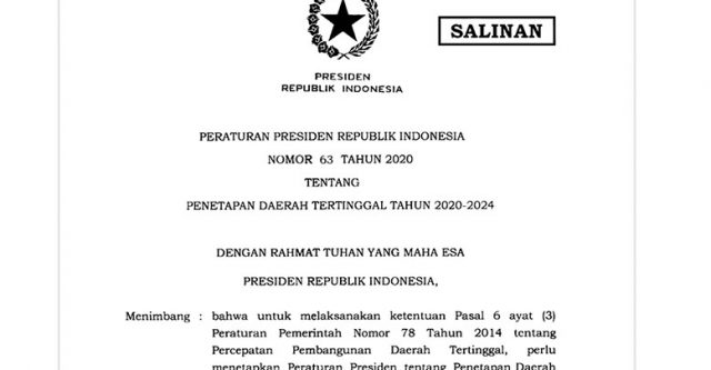 JAKARTA – Presiden Joko Widodo menandatangani Peraturan Presiden Nomor 63 Tahun 2020 tentang Penetapan Daerah Tertinggal Tahun 2020-2024. Dalam Perpres yang diteken 27 April 2020 itu, terdapat 62 kabupaten sebagai