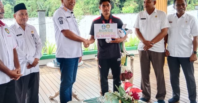 HALSEL — Bupati Kabupaten Halmahera Selatan Hi Usman Sidik memberikan hadiah khusus dengan nilai uang Rp 50 juta kepada Asri Udin, petinju yang berhasil mengharumkan nama Daerah menyabet medali perak