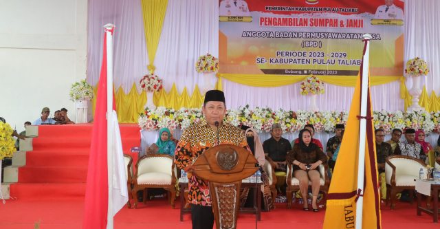 TALIABU – Bupati Pulau Taliabu, Provinsi Maluku Utara, Aliong Mus, melakukan pengambilan sumpah dan janji 459 Anggota Badan Permusyawaratan Desa (BPD) periode 2023-2029 se-Pulau Taliabu. Pengambilan sumpah janji tersebut berlangsung