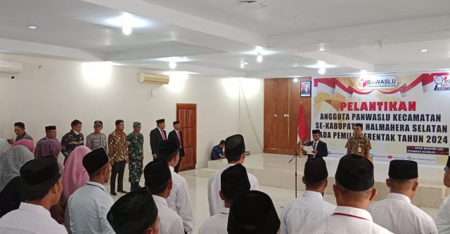 HALSEL – Bawaslu Halmahera Selatan resmi melakukan Pelantikan dan pengambilan sumpah/janji sekaligus pembekalan kepada 90 anggota Panwaslu tingkat kecamatan di kabupaten Halmahera Selatan (Halsel) pada Pemilu serentak tahun 2024. Pelantikan
