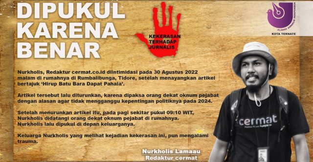 TERNATE – Aliansi Jurnalis Independen (AJI) Ternate mengecam penganiayaan terhadap Nurcholis Lamau, redaktur Cermat partner resmi Kumparan di rumah korban, RT05, Kelurahan Rum Balibunga, Kota Tidore Kepulauan, Rabu (31/8/2022). Pemukulan