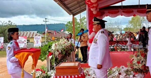 TALIABU – Bupati Kabupaten Pulau Taliabu, Provinsi Maluku Utara (Malut), Aliong Mus menjadi Inspektur Upacara Hari Ulang Tahun Republik Indonesia (HUT RI) ke-77 di Gelanggang Olahraga (GOR) Bobong, Rabu (17/08/2022).