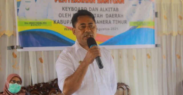 HALTIM, MALUT — Bupati Halmahera Timur Drs. Ubaid Yakub, MPA didampingi Sang Istri Ny. Sitinur Hj. Ma’bud Ubaid dan Sejumlah Pimpinan Organisasi Perangkat Daerah (OPD) Menyerahkan bantuan Alkitab dan Alat