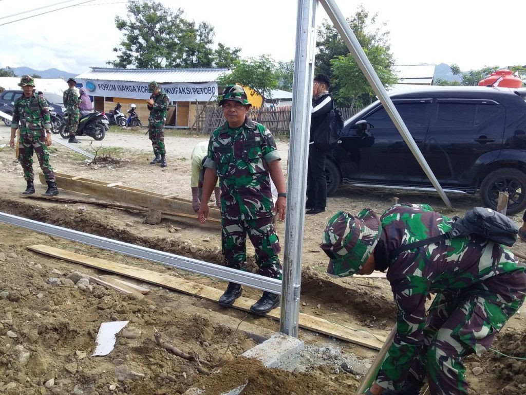 Palu – Prajurit TNI dari Batalyon Infanteri 714/Sintuwu Maroso (Yonif 714/SM) dan Kodim 1306/Donggala yang tergabung dalam Komando Tugas Gabungan Terpadu (Kogasgabpad) penanggulangan bencana gempa bumi, tsunami dan likuifaksi, membantu pembangunan Sekolah Dasar bagi anak-anak korban bencana alam yang terjadi di Sulawesi Tengah.